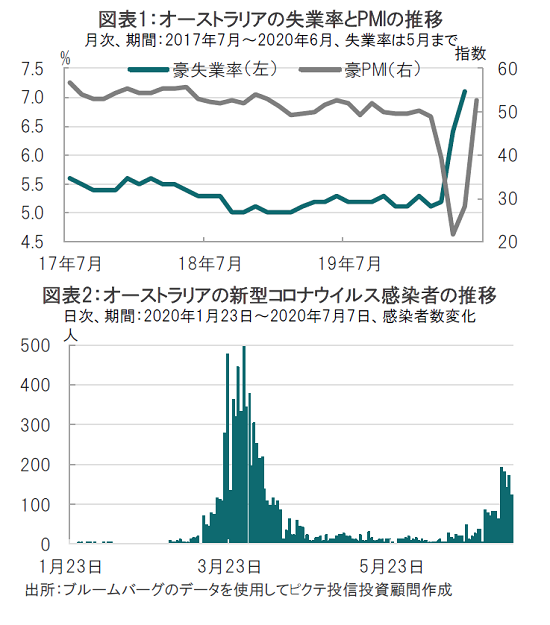 なお、声明に言及されていませんが、オーストラリアでは新型コロナウイルスの感染者が再び増加傾向です(図表2参照)。オーストラリア第2の都市メルボルン周辺で感染が拡大しビクトリア州では6週間の都市封鎖が発表されています。