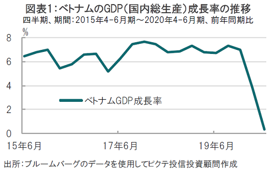 まず、ベトナムの経済状況を簡単に振り返ります。ベトナムのGDP(国内総生産)成長率は20年4-6月期が前年同期比+0.3%となっています(図表1参照)。新型コロナウイルスの感染抑制のための経済活動の制限を反映しています。例えば、観光客の多いホーチミン市を訪れた観光客は、年前半におおよそ6割程度減少しています。