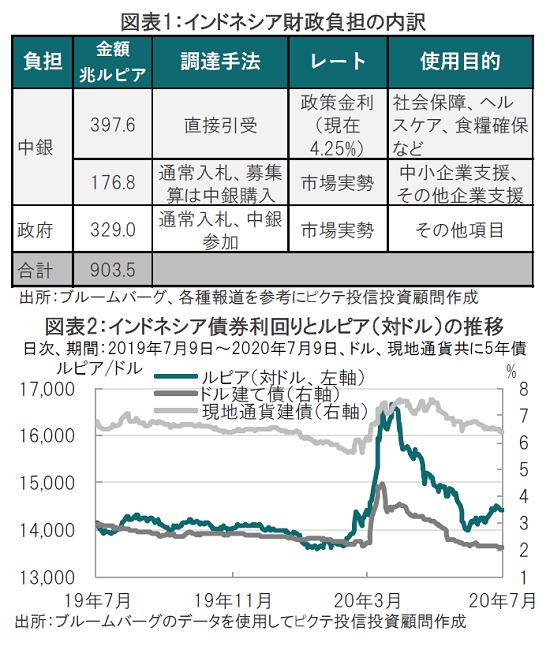 合意によると、新型コロナウイルス対策として約900兆ルピア(約6兆6400億円)を調達するうち、インドネシア中銀が約400兆ルピアを直接引き受けるとしています(図表1参照)。