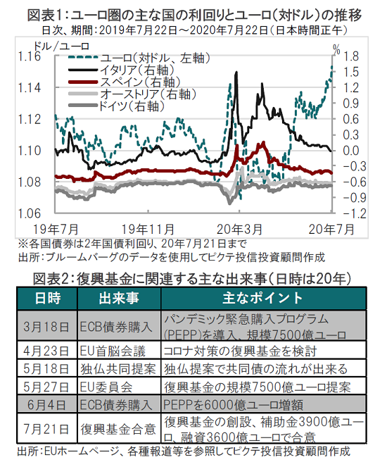 復興基金がようやく合意に達しました。補助金の割合を減らすなど、財政負担を懸念する4ヵ国への配慮から妥協した面もありますが、欧州の結束が示せたことは大きな成果と見られます。市場でもユーロ(並びに欧州株式)は上昇しました(図表1参照)。欧州の国債利回りは比較的落ち着いていますが、コロナ前の水準をうかがう推移となっています。