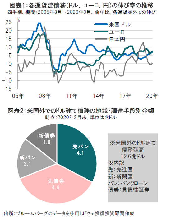 まず、ここで使用しているドル建債務の意味を再確認すると、米国以外で、非銀行の借り手に対する債務としています。図表1は同じような定義で、ドル建、ユーロ建、円建債務の伸び率の推移を示しています。ドル建ての伸びが高いことは、ドル建債務、またはドルへのニーズが高いことを示しています。