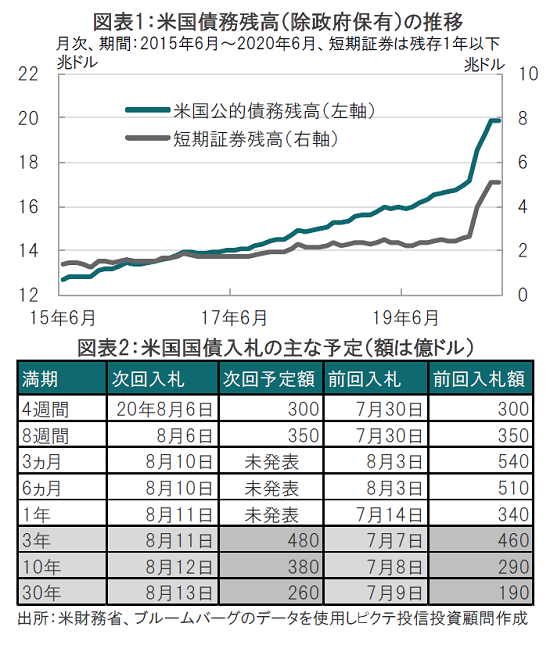 新型コロナウイルス感染拡大に伴う景気の低迷に対し積極的な財政政策が繰り出されています。この資金は国債発行で調達される模様ですが、従来、この大半はTビルのような短期国債で調達されています(図表1参照)。