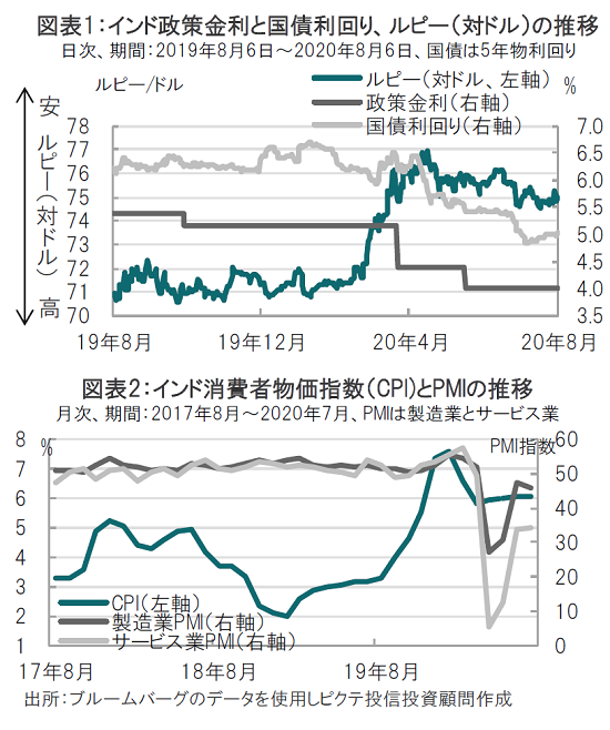 全国的な経済制限は緩和されましたが、足元一部地域で制限が強化されています。7月の製造業とサービス業購買担当者景気指数(PMI)は頭打ちです(図表2参照)。インド中銀の会見でもダス総裁はモビリティデータが鈍化していることを指摘していますが、確かに8月データを見ても回復は鈍いままで、感染再拡大の影響がうかがえます。