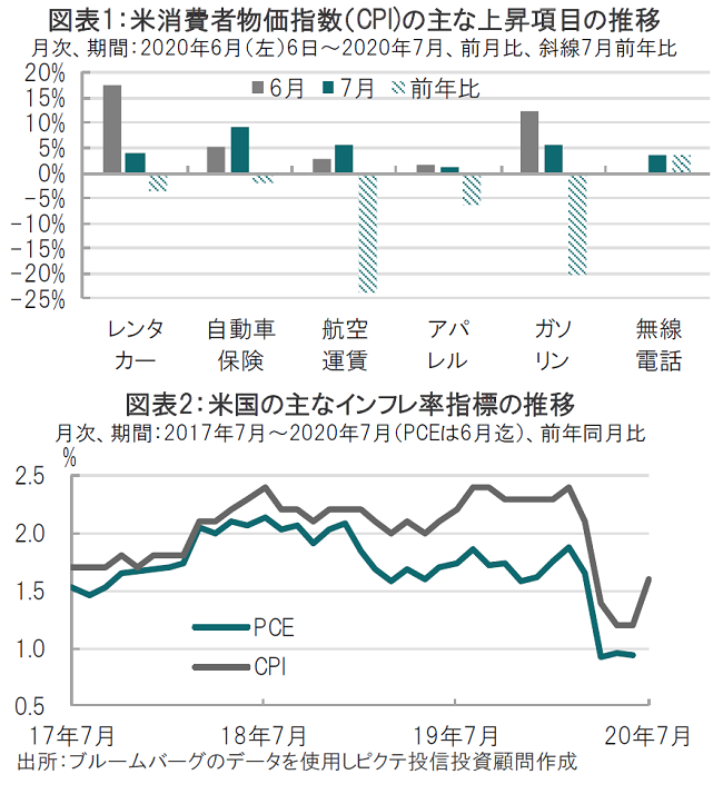 図表1の各項目の一番右、斜線で示したグラフは7月の価格を前年同月比で見たものです。航空運賃やガソリンは前月比では6月、7月と上昇し、足元の回復は示唆していますが、1年前に比べると水準は低いままです。