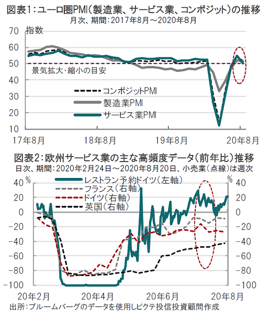 IHSマークイットが2020年8月21日に発表した8月ユーロ圏コンポジット(総合)購買担当者景気指数(PMI、速報値)は51.6と、市場予想(55.0)、7月(54.9)を下回りました(図表1参照)。