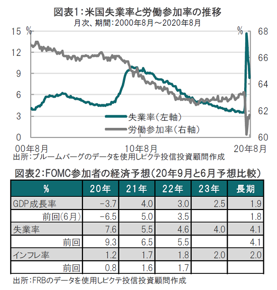 もしそうであるなら、フォワードガイダンスで雇用の最大化を明示したことは、景気回復を目指す段階では雇用の回復も含めた政策運営が想定されます。ただ、その運営には課題も残されていると見ています。インフレ率は個人消費支出(PCE)価格指数で2%と目標が数字で示されていますが、雇用最大化はそうではありません。一般には(低い)失業率で雇用の健全さが測定されます(図表1参照)。しかし、雇用市場からの退出による労働参加率の低下が失業率を低下させているとすれば望ましい失業率低下とはいえないでしょう。またパウエル議長は人種間などで雇用に違いがあれば社会的に不安定となる可能性も指摘しています。失業率の重要さは変わらないとしても、別の指標も注目されるかも知れません。