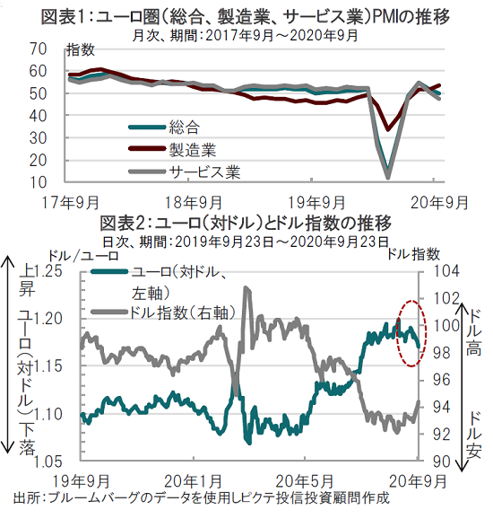 IHSマークイットが2020年9月23日に発表した9月のユーロ圏総合購買担当者景気指数(PMI)は50.1と、市場予想(51.9)、前月(51.9)を大きく下回りました(図表1参照)。なお、同指数は50が景気拡大、縮小の目安です。