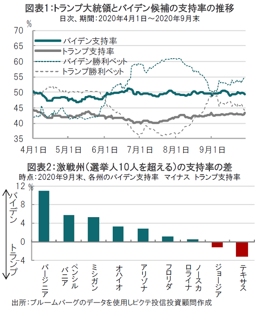米大統領選では各州の選挙人を総取りする方式です。そこで激戦州の動向によると、バイデン氏が優勢に見えます(図表2参照)。ただ選挙人の多いテキサス(38)をトランプ氏が抑え、フロリダ(29)も僅差で、現時点では激戦州の動向は読みづらいともいえそうです。