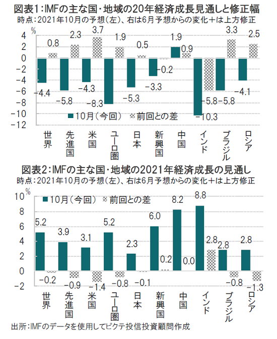 国際通貨基金(IMF)は2020年10月13日に最新の世界経済見通し(WEO)を発表しました。20年の世界成長率予想をマイナス4.4%と6月時点の予想から0.8%上方修正しました(図表1参照)。一方で、21年成長率はプラス5.2%と予想し、前回の5.4%から0.2%引き下げました(図表2参照)。