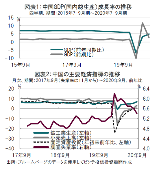 中国の国家統計局が2020年10月19日に発表した20年7-9月期の実質GDP(国内総生産)成長率は前年同期比で4.9%と4-6月期(3.2%増)を上回りました(図表1参照)。ただ市場予想(5.5%増)は下回りました。