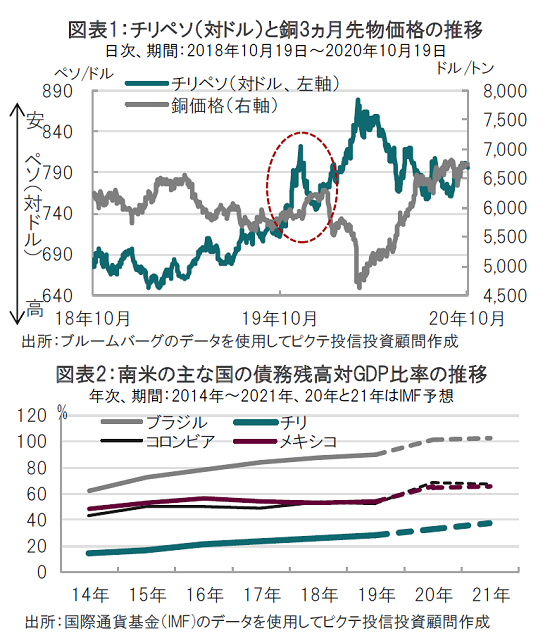 チリの通貨ペソの動向を語る場合、銅価格の要因が高いことが知られています(図表1参照)。銅価格の下落(上昇)がペソ安(高)となる傾向が見られます。今回は、銅価格以外の要因として格差問題を取り上げ、具体的事例として年金問題のみを述べます。なお、昨年のチリで起きた抗議活動は地下鉄運賃の値上げはきっかけに過ぎず、背景は不公平感や格差問題と見ています。