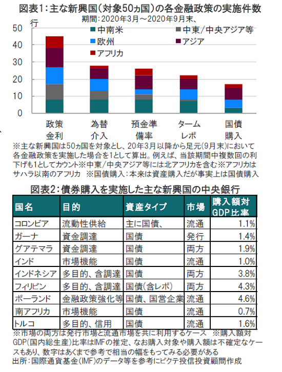 国際通貨基金(IMF) は2020年10月版の国際金融安定性報告書(GFSR)でコロナ感染拡大時における新興国の金融政策を取り上げています(図表1参照)。