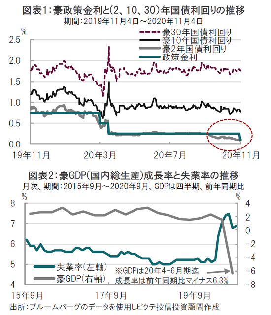 オーストラリア(豪)準備銀行(中央銀行)は2020年11月3日の理事会で、市場予想通り政策金利を0.25%から引き下げ、過去最低の0.1%にすると発表しました(図表1参照)。