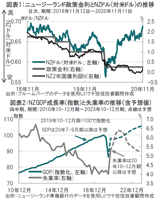 まず、NZ中銀がマイナス金利導入姿勢を弱めたと市場が判断した要因として、NZ中銀の景気認識が底堅い点が挙げられます。例えば、NZのGDP(国内総生産)成長率は20年4-6月期に前期比マイナス12.2%に急低下しましたが、NZ中銀の(今回の)予想では同+13.4%へ急回復すると見込んでいます(図表1参照)。また、NZ中銀の前回(8月時点)の予想では7-9月期のGDPは同+12.2%を見込んでいましたが1.2%上方修正しています。NZは8~9月頃に最大都市オークランド周辺で都市封鎖を実施しましたが、対応が早かったこともあり感染再拡大はほぼ抑制されています。NZ中銀はクレジットカードの使用状況等から足元の景気動向も確認したうえで、景気は思っていたより底堅いと評価しているようです。