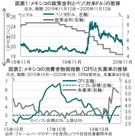 メキシコ銀行(中央銀行)は2020年11月12日、金融政策決定会合を開催し、政策金利を4.25%で据え置きました(図表1参照)。5人の委員のうち1人の委員が0.25%の利下げを主張し、全会一致とはなりませんでした。市場の事前予想では利下げ、据え置きと見方が分かれていました。