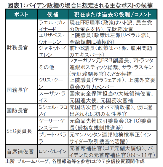 トランプ大統領は選挙結果を認めるかについて不規則な発言を続けていますが、一方でバイデン氏は2020年11月11日には長年の側近であるロン・クレイン氏を大統領首席補佐官に内定(図表1参照)するなど動きはじめています。
