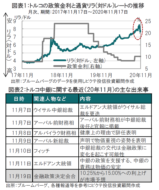 トルコ中央銀行は2020年11月19日に金融政策会合の開催を予定しています。市場予想では政策金利を10.25%から15.00%に引き上げると見込まれています(図表1参照)。