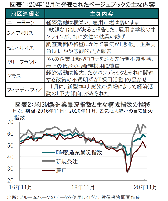 米連邦準備制度理事会(FRB)は2020年12月2日に地区連銀経済報告(ベージュブック)を公表しました。経済は大半の地域で緩やかな回復が確認されました。ただ、新型コロナウイルスの感染が特に拡大している地域では減速の兆候が示されました(図表1参照)。ベージュブックの冒頭文章は、経済の拡大ペースについてほとんどの地区が「緩慢ないし緩やか」であることが示唆されていますが4地区はほぼゼロ、ないしはゼロ成長と指摘しています。