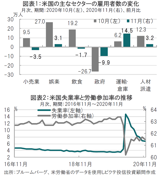 まず、非農業部門雇用者数は前月比で24.5万人の増加でした。ちなみに、コロナ前の19年の前月比の増減の平均は約18万人でした。単純な数比べなら「普通」の水準に戻っただけですが、内容が異なります。10月は約61万人増え、9月は約71万人増であったのに比べ減速感は否めないからです。背景として新型コロナの感染再拡大が雇用に影を落としていると見ています。12月月初に公表された米地区連銀経済報告(ベージュブック)でも、(コロナで)売上が伸び悩む中、採用を控える声が数多く報告されているからです。