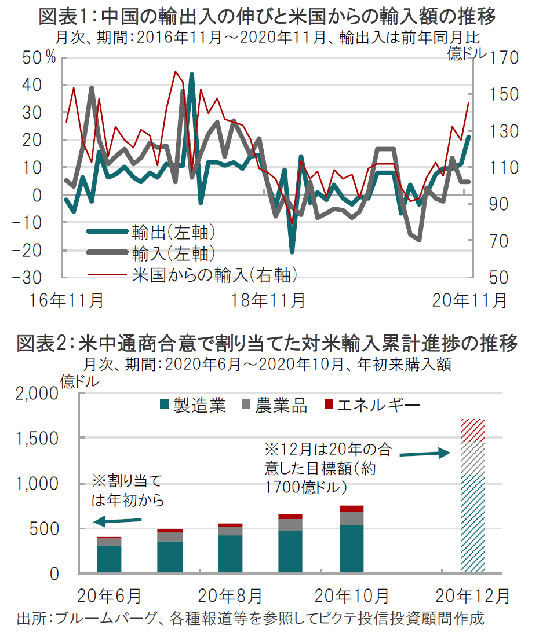 中国税関総署が2020年12月7日に発表した11月の貿易統計(ドル建て)によると、輸出は前年同月比21.1%増と、市場予想(12.0%増)、前月(11.4%)を大きく上回りました。一方、輸入は同4.5%増と市場予想(7.0%増)を下回り、前月(4.7%増)並みとなりました(図表1参照)。