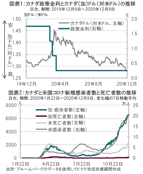 カナダ銀行(中央銀行)は2020年12月9日、市場予想通り政策金利を0.25%で据え置くと発表しました(図表1参照)。据え置きは6会合連続です。