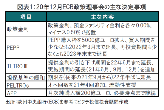 欧州中央銀行(ECB)は2020年12月10日に開催した政策理事会で、事前予告どおり追加金融緩和を決定しました。ただユーロ高に対する発言は従来どおりの内容にとどまりました。主な決定内容は新型コロナウイルス対応の資産購入特別枠(PEPP)を5000億ユーロ拡大(総額1.85兆ユーロ、現在は1.35兆ユーロ)です(図表1参照)。