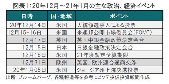 2020年は新型コロナウイルスが市場動向に大きく影響しました。来年も、既に開始されたワクチン接種の拡大ペースが経済活動に影響を与えるなど、コロナの話題は続くものと見込まれます。そのような中、年末から年始にかけて主な経済、政治イベントのポイントを確認したいと思います。