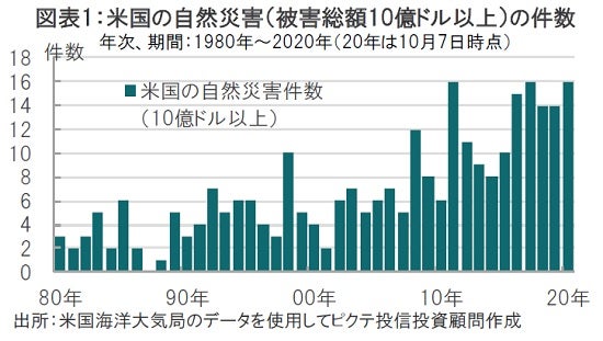 一方で、米国でも気候変動が原因と見られる災害(干ばつ、洪水、ハリケーンなどの暴風雨、山火事、吹雪など)は増加しています(図表1参照)。米海洋大気局のデータによると、被害総額が10億ドル(約1000億円以上)を超える災害の件数は右肩上がりです。特に多いのがハリケーンや暴風で件数が増えてきた16年以降では6割から8割以上を占めています。また大規模な山火事もほぼ毎年発生しているなど、自然災害の拡大は印象ではなくデータでも確認でき、米国でも気候変動への関心や懸念は高まっています。