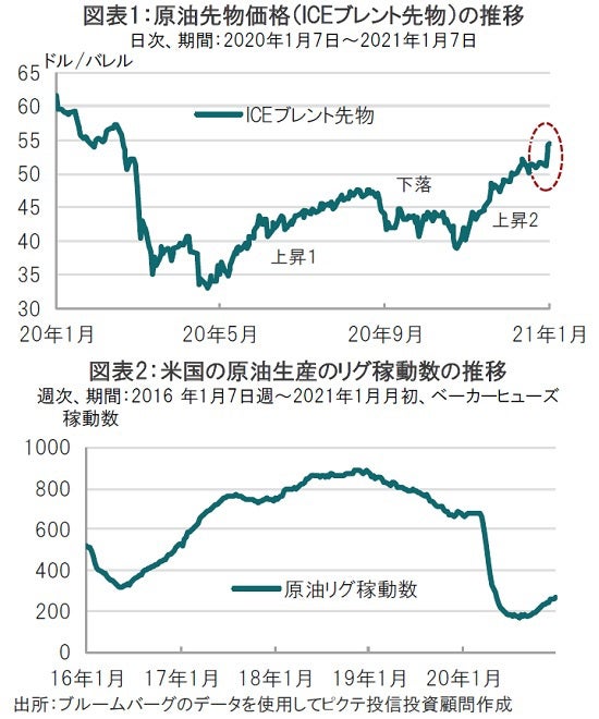 まず、原油市場の動向について新型コロナウイルスの影響などで急落した昨年春以降を振り返ります(図表1参照)。