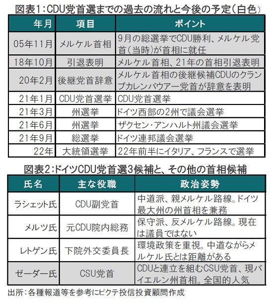 ドイツ与党、キリスト教民主同盟(CDU)は2021年1月16日に党首選挙を開きます(図表1参照)。 21年9月の連邦議会選挙後にメルケル首相は政界を引退することを表明しており、新たなCDU党首は次の首相の有力な候補です。