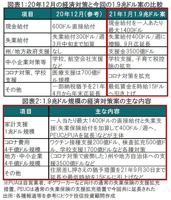 米国のバイデン米次期大統領は2021年1月14日、1.9兆ドル(約200兆円)規模の新たな経済対策案(以後1.9兆ドル案)を発表しました。現金給付を1人当たり最大1400ドル支給するほか、失業給付の延長など家計支援や新型コロナウイルス対策が主体となっています(図表1参照)。
