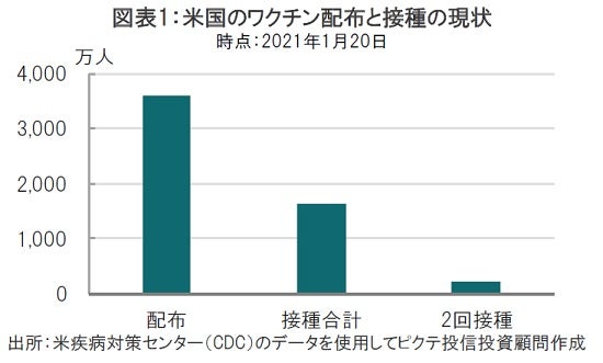 なお、米疾病対策センター(CDC)によると、足元でのワクチン接種は約1650万人となっています(図表1参照)。一方で配布は約3600万回分となっており、ワクチン接種の問題はワクチン生産など供給もさることながら、接種のプロセスに改善が必要なようです。ただ、ワクチン接種の最終権限は地方自治体が抑えており、バイデン政権の対応には難しい面も想定されます。それでも今後はワクチン接種の達成率に注目する展開が想定されます。
