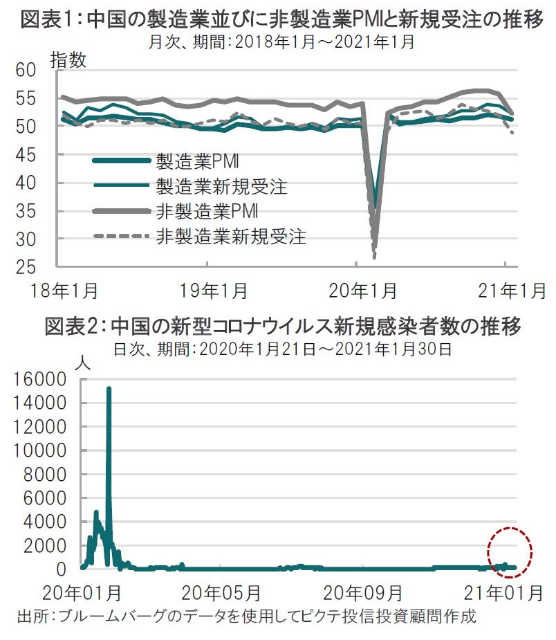 北京など中国北部を中心に、昨年末ごろから中国で新型コロナウイルスの感染が再拡大しています(図表2参照)。1月のPMIが小幅下落したことの背景と見られます。PMIに対する影響を製造業と非製造業に分けると、サービス業を含む非製造業の影響が大きくなっています。PMIは目先軟調となるも、当局のコロナ対応は迅速であるため、比較的早期の回復が想定されます。