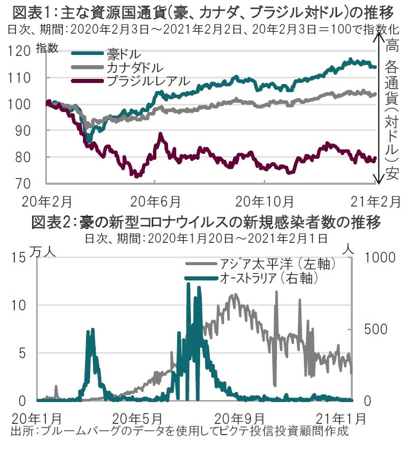 豪中銀は、豪ドル高も念頭にはあったと思われます。コロナによる急落の後の豪ドルの動向を見ると、他の資源国に比べ上昇傾向だからです。主な背景は最大の貿易相手国である中国の回復と、コロナ感染をほぼ完全に抑制(図表2参照)したことなどがあげられます。豪のコロナ感染者数は昨年9月に100人を下回り、足元では一桁となっています。