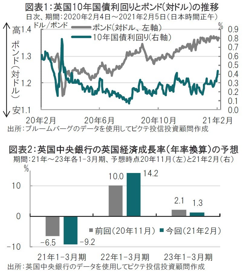 一方で、英中銀の経済予想を見ると、比較的楽観的なトーンとなっています。英国では足元新型コロナウイルスの感染拡大に伴い経済活動が制限されていることから、21年1-3月期の成長率についは昨年11月時点の予想から下方修正しています。しかしながら、英中銀は今後について、英国におけるワクチン接種の拡大が景気回復を下支えすることに期待感を示しています。また、経済活動の制限についても、昨年前半の全面的な活動制限とは異なり、景気への悪影響が低い可能性も指摘しています。