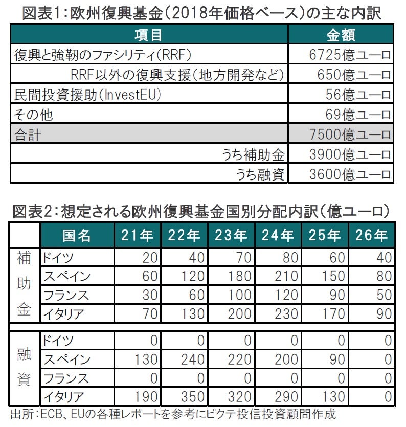 第2段階の成長軌道への回復は昨年7月の欧州連合(EU)首脳会議で合意された7500億ユーロ規模のいわゆる欧州復興基金(NGEU)が主役と述べています(図表1参照)。