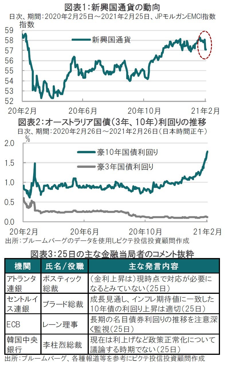 一方で、金融政策をつかさどる当局者の長期金利上昇に対する見方にバラツキがあります(図表3参照)。なおピクテの経済チームは米国の1-3月期成長率は前期比年率で6%を超える可能性があるとみているなど、米国経済は堅調で、国を越えた当局の見方に違いがあるのはある意味当然と思われます。ただ、米国債利回りが1.6%を超えた時間を考え合わせると、利回り上昇が適切との発言は長期金利上昇を加速させた可能性があります。一方、欧州中央銀行(ECB)レーン理事や、韓国銀行(中央銀行)総裁のコメントからは金利が上がるのは仕方ないにしてもスピードには不安があるようです。