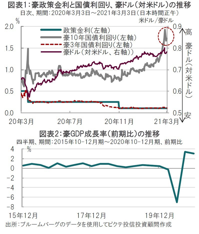 オーストラリア(豪)準備銀行(中央銀行)は2021年3月2日の理事会で市場予想通り政策金利を0.1%に据え置きました。また、イールドカーブコントロール(3年物国債利回り)の目標(0.10%)も維持しました(図表1参照)。