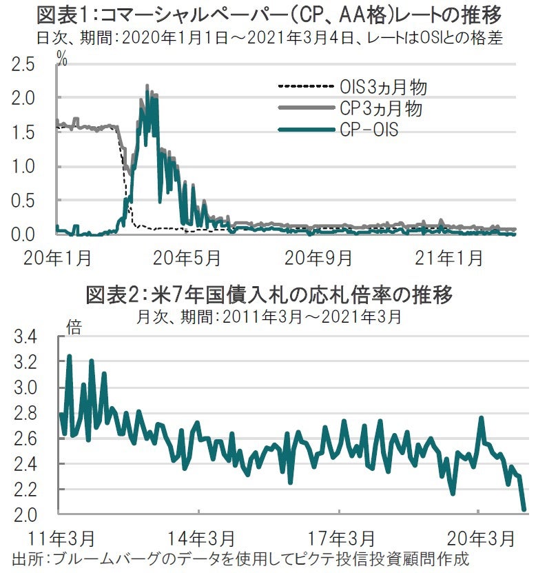 次に、これまでのところ市場の秩序が著しく崩れたとは見ていないことです。1年前、FRBは前例にとらわれない市場介入を実施しました。その引き金の一つは短期金融市場の不安で、コマーシャルペーパー(CP)での調達がタイトとなったことでした(図表1参照)。また当時懸念された国債指標銘柄と他銘柄との利回り格差も比較的安定しています。仮に市場の秩序が崩れたらFRBは対応する姿勢です。