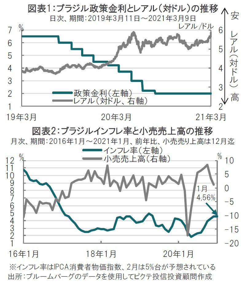 ワクチン接種の拡大による景気回復期待から資源価格は概ね上昇傾向です。しかしながら、世界でも有数の資源大国であるブラジルの通貨レアルは相対的に軟調です。最近の米国長期金利の上昇や、新型コロナウイルスは新興国全般に影響を与えており、ブラジルも同様に影響を受けています。ただ、相対的に(他の新興国に比べ)レアルが弱い背景として主にブラジル独自の事情が考えられます。