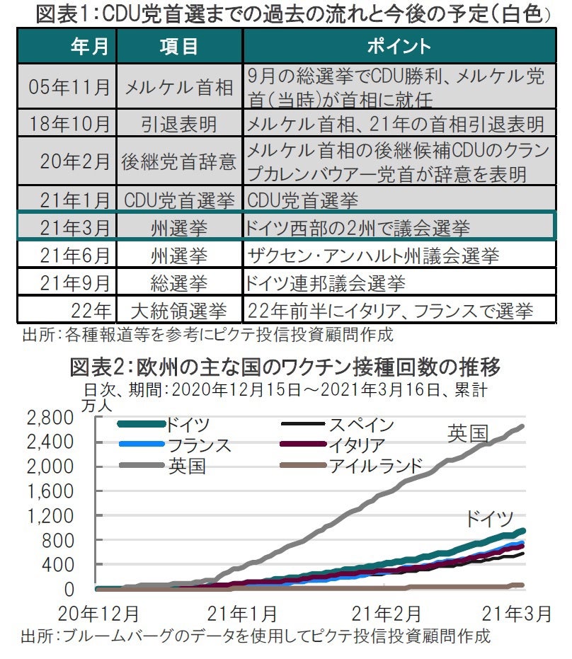ドイツの二つの州(バーデン・ビュルテンベルク州、ラインラント・プファルツ州)で2021年3月14日に州議会選挙が行われました(図表1参照)。与党CDU(キリスト教民主同盟)は、両州とも得票率が前回選挙より低下し、第2次大戦以降において最低の得票率で敗北しました。
