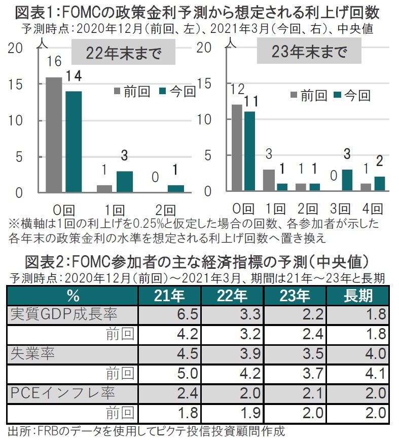FOMCの経済予測の数字では引締め路線に一理ありそうです。例えば、失業率は来年には長期失業率の4.0%を下回り、23年には3.5%にまで低下する見通しです(図表2参照)。経済成長率は巨額の財政法案が立て続けに成立したことを背景に、21年が6.5%と、前回予測の4.2%から上方修正されました。なお、ピクテでも1.9兆ドル規模の追加経済対策成立の可能性が高まった段階で今年の米国の成長率を同じ6.5%に引き上げており、大幅な上方修正ながら違和感はない印象です。