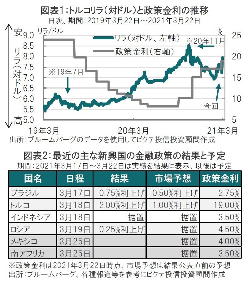 トルコ中央銀行は2021年3月18日、政策金利の1週間物レポ金利を19.00%へと、これまでの17.00%から引き上げました(図表1、2参照)。市場では1.00%引き上げ18.00%にすると予想されていました。