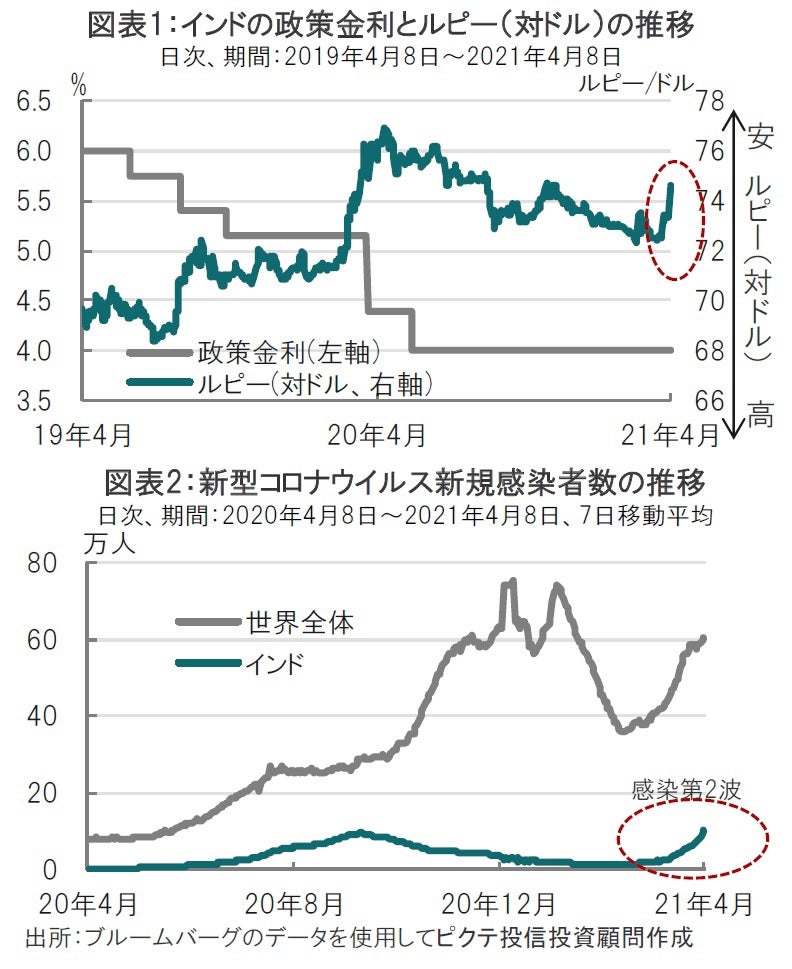 インド準備銀行(中央銀行)は2021年4月5日~7日の金融政策委員会で、市場予想通り政策金利を年4.0%で据え置くことを決めました(図表1参照)。据え置きは5会合連続です。物価上昇を警戒しつつも、新型コロナウイルスの感染者急増などを踏まえ(図表2参照)、金融政策姿勢は「緩和的」を維持するとしています。