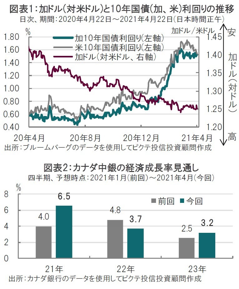 2つ目の要因であるカナダ中銀の経済見通しについては、カナダ中銀の21年のカナダ経済の成長率見通しが6.5%へと大幅に引き上げられたことなどに示されています(図表2参照)。カナダ中銀は金融政策レポートで上方修正の理由として交易条件の改善、追加財政政策、足元では新型コロナウイルスの感染再拡大が懸念されるものの、ワクチン接種の拡大や経済再開などによる年後半の消費者マインド改善などをあげています。一方、21年のインフレ率予想は2.3%と、前回の1.6%から上方修正しています。カナダ中銀はインフレ率上昇は一時的要因によると説明しています。