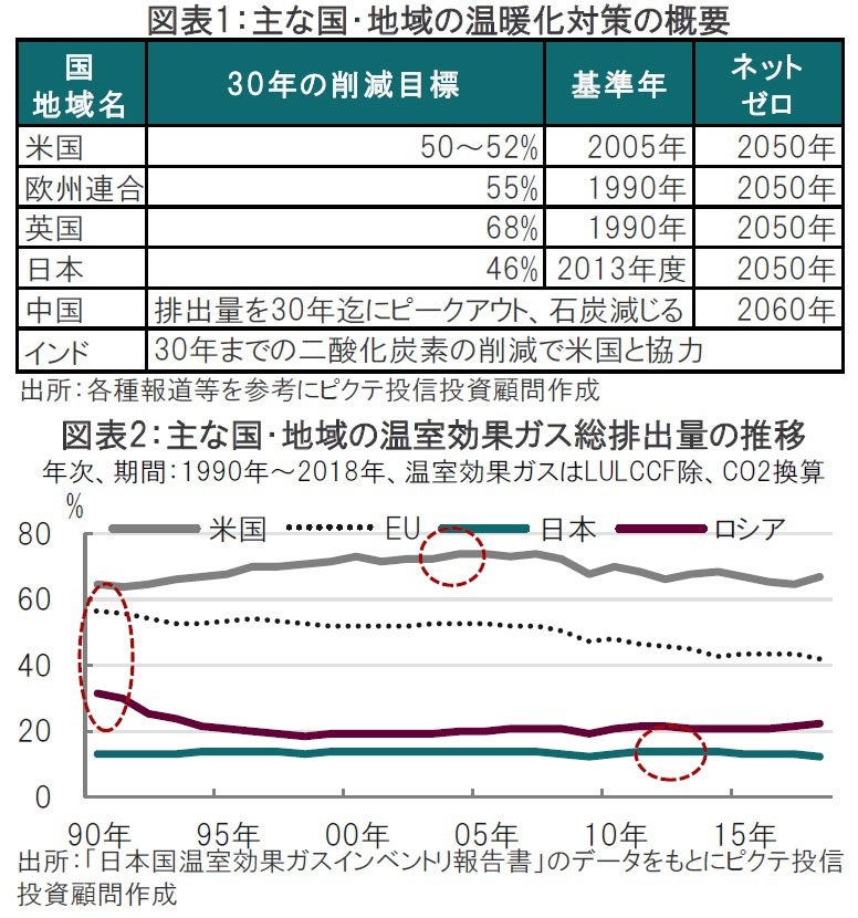 地球温暖化防止を目指す「パリ協定」の目標実現に向けて、2030年時点における温室効果ガス(大部分が二酸化炭素)の排出削減目標の引き上げや、排出を実質ゼロにする時期の計画が示されました(図表1参照)。