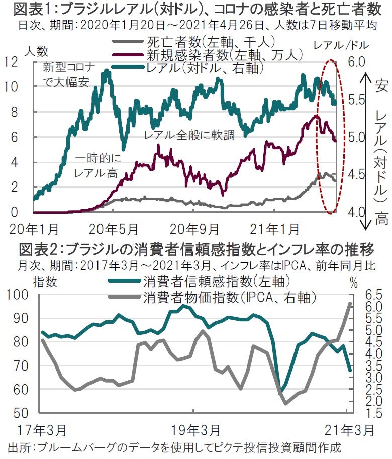 まず、新型コロナの1日あたりの新規感染者数を見ると、依然水準は高いものの7日移動平均で足元5万人台と、3月中旬の7万人台から減少しています(図表1参照)。新規感染者に遅行する傾向がある死亡者数も減少しています。昨年後半から見られた感染者数や死亡者数とレアルの関係から、新型コロナの動向によってはレアルのサポート要因となる可能性も考えられます。