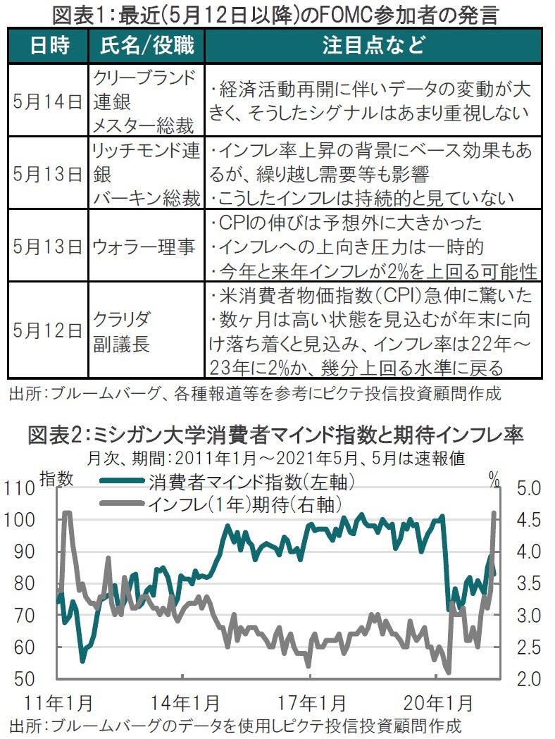 米国の4月の消費者物価指数(CPI、12日公表)が市場予想を大幅に上回ったことで、インフレ率上昇懸念が高まりました。しかし金融政策の決定の場である米連邦公開市場委員会(FOMC)参加者はインフレ率の上昇が一過性との意見が支配的のようです。ただ市場ではインフレを懸念する声が根強く、解釈を巡って市場の変動も想定されます。