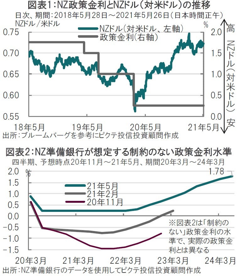 またNZ中銀は21年1-3月期のGDP(国内総生産)成長率予想を2月時点の前期比でマイナス0.3%から、5月時点の予想は同マイナス0.6%と下方修正しました。一方で、政策金利については、制約のない政策金利というラフな目安ながら、22年の利上げ開始を示唆しました(図表2参照)。