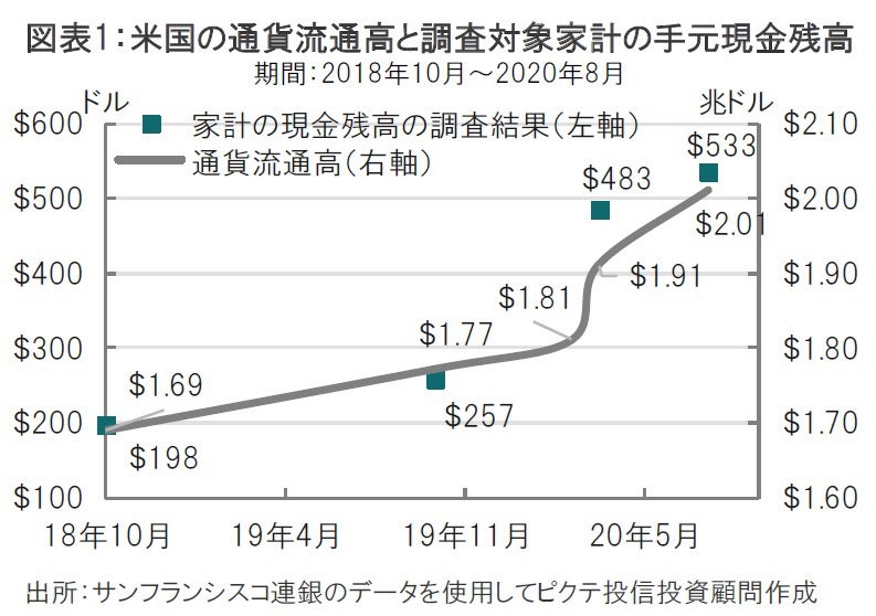 新型コロナに関して別のテーマとして、非接触決済としてデジタル決済が注目されました。ただ、仮に将来デジタルドルが導入されたとしても、現金との併用は当面続きそうです。ブレイナード理事はパンデミックにおいて個人の手持ちの現金残高が増えたことを指摘しています(図表1参照)。先のCARES法などで市中の通貨流通高が増える中、接触を嫌って全ての現金を別の形態で所有するわけでなく、個人はポケットのお金もそれなりに増やしていたということを講演資料で指摘しています。勿論、対面決済の一部はデジタル決済に移したとの結果も示されていますが、現金を手元に残したい気持ちもあるようです。ブレイナード理事は安全で、信頼された決済手段である現金を求める声がある限り、提供を続けることが金融当局の義務との考えを述べています。その通りだと思います。